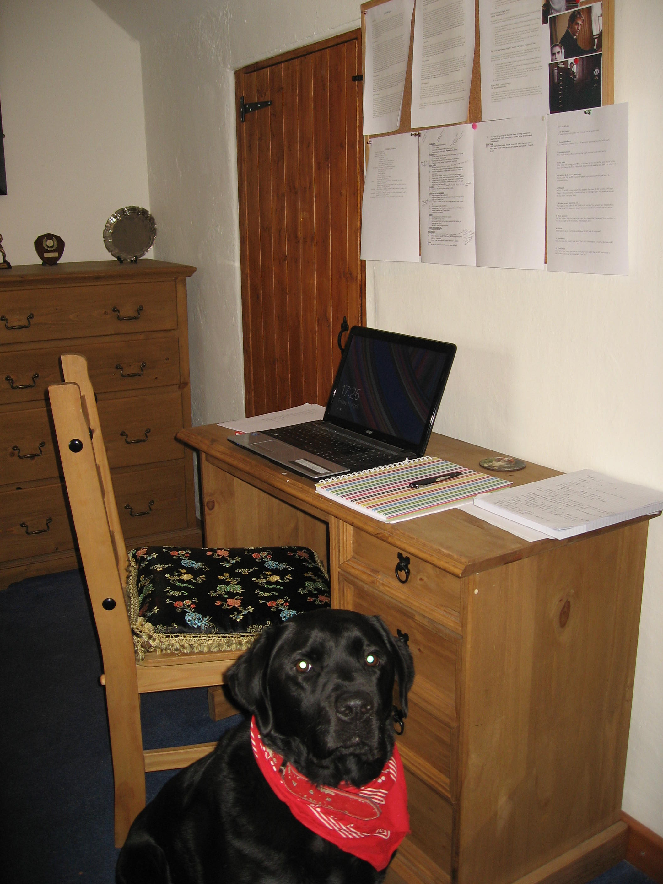 Today, I’ve got novelist and poet Brenda Hawkey on the blog, telling us all about her writing space. We’ve got the lovely Alfie too! Always happy to have doggy company – and he’s just gorgeous!