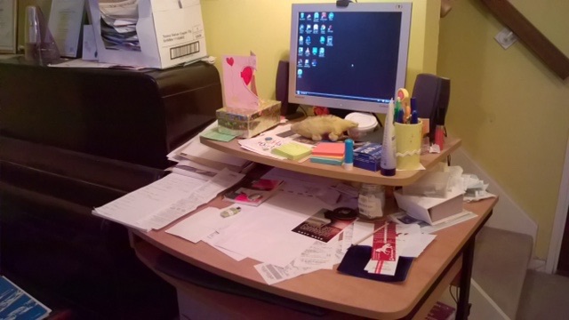 You won’t believe it, but when this picture was taken I’d recently had a clear-up of my desk. I look with envious bewilderment at writers who manage to keep their writing space clear of clutter. I’ve never managed it, but since I’d always rather write a paragraph than tidy up I’ve long since faced the fact that seeing the surface of my desk will always be a rare treat.