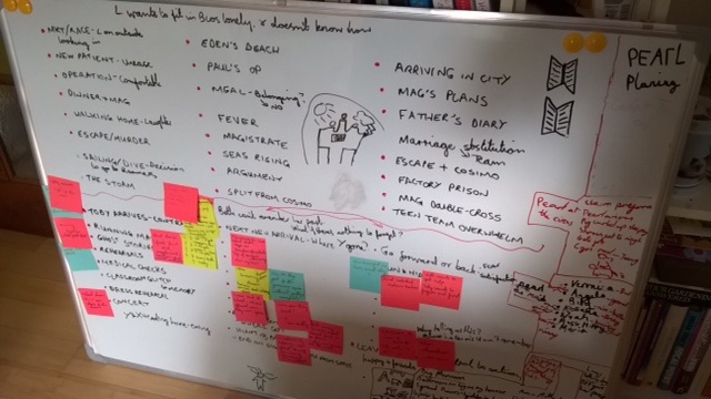 You may also be able to make out a couple of notebooks on the desk – that’s my other writing must-have. Before I get to the Post-It note/whiteboard stage I’ll have spent a long time making notes of ideas, snatches of dialogue and character traits so I don’t forget them when it comes to the writing stage.